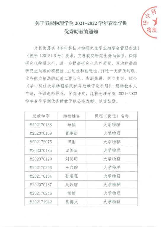 关于表彰2021-2022学年春季学期优秀助教的通知