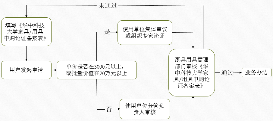 单价3000元以上,批量20万以上的家具,需提交采购申请后,下载申购论证表并办理审批手续,再在系统里"我的采购业务列表中"上传申购论证表的照片,另将纸质版申购论证表送到房产管理处;