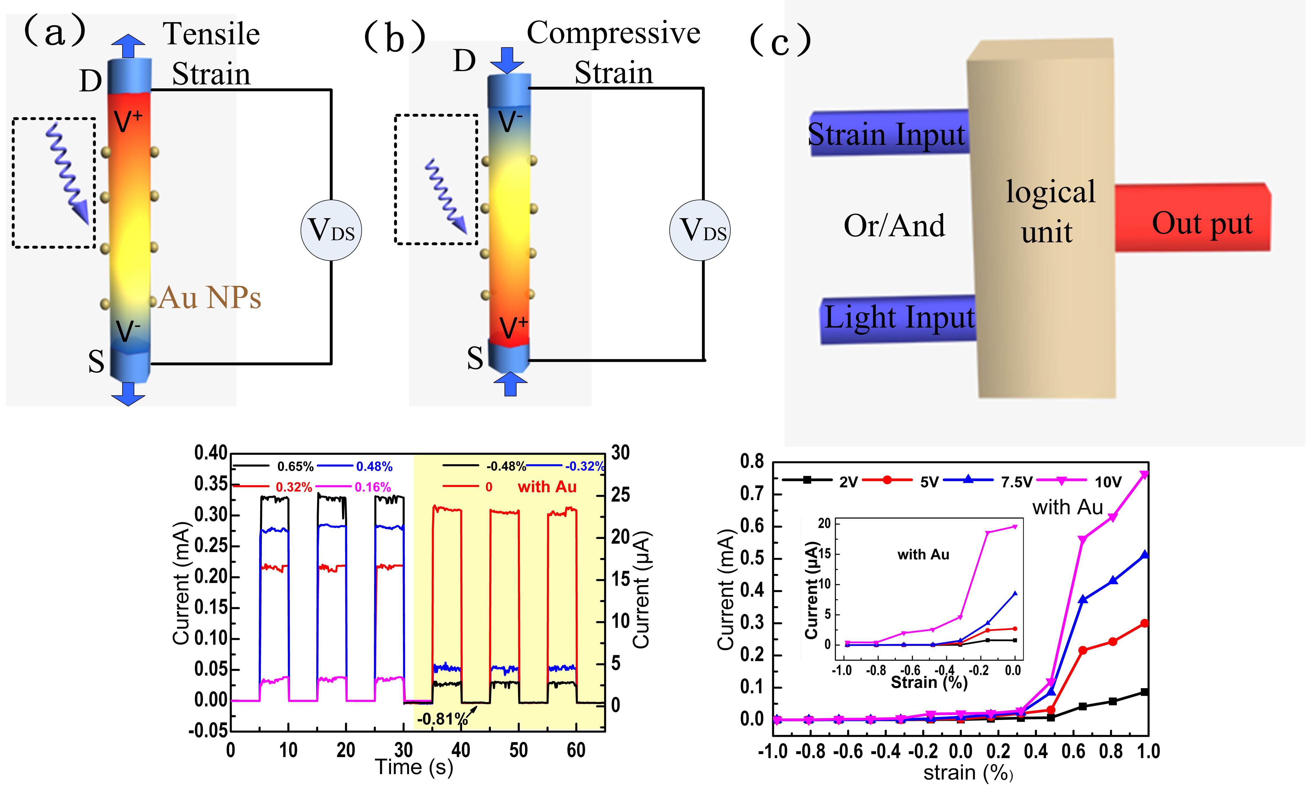 图(a)ZnO纳米线压电晶体管在拉伸应力作用下压电势分布示意图;(b)ZnO纳米线压电晶体管在压缩应力作用下压电势分布示意图;(c)压电逻辑单元示意图;(d)在7.5 V的偏压条件下,金颗粒修饰的ZnO应力门控晶体管对应于几种不同的周期性应力条件下的IDS-T特征曲线;(e)分别在偏压2 V、5 V、7.5 V 和10 V条件下,源、漏级电流和对应不同应力的转移特性曲线。