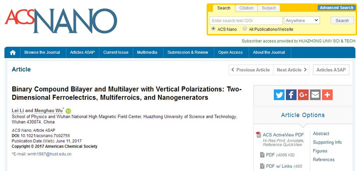 6月11日,纳米学权威期刊《ACS Nano》在线刊发了公司凝聚态物理研究所吴梦昊教授团队的研究论文《二元双层和多层结构的垂直极化:二维铁电体,多铁体及纳米发电机》(Binary Compound Bilayer and Multilayer with Vertical Polarizations: Two-Dimensional Ferroelectrics, Multiferroics, and Nanogenerators)。论文第一作者为公司2016级博士生黎磊,吴梦昊教授为论文通讯作者。