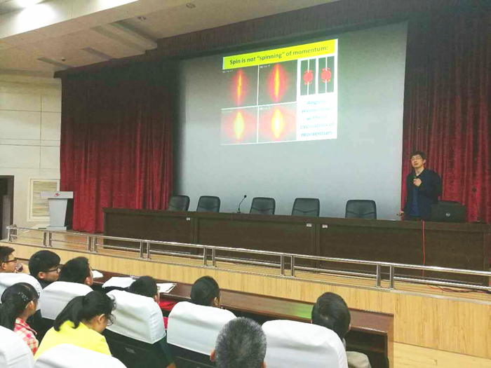 陈经理从比萨斜塔实验中的两个铁球同时落地谈起,介绍了物质波的概念,以及广义相对论、规范场论、量子力学、波粒二象性、自旋、时空的弯曲和扭曲等物理学前沿知识,阐述了物理和物理思维的特点。陈教授同时还介绍了公司在物质波方面的研究及最新进展,以及公司在我国科技、军事、航天等领域所做的贡献。报告后陈经理与在场同学进行了热烈的互动。