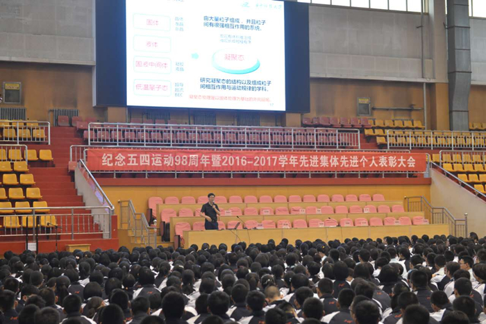 2017年5月4日上午10:30点,河北省正定中学体育馆人头攒动,公司副经理吕京涛教授回到母校,为该校2000多名员工作了题为《漫谈凝聚态物理学》的科普报告,河北招生组栾丽霞老师陪同前往。