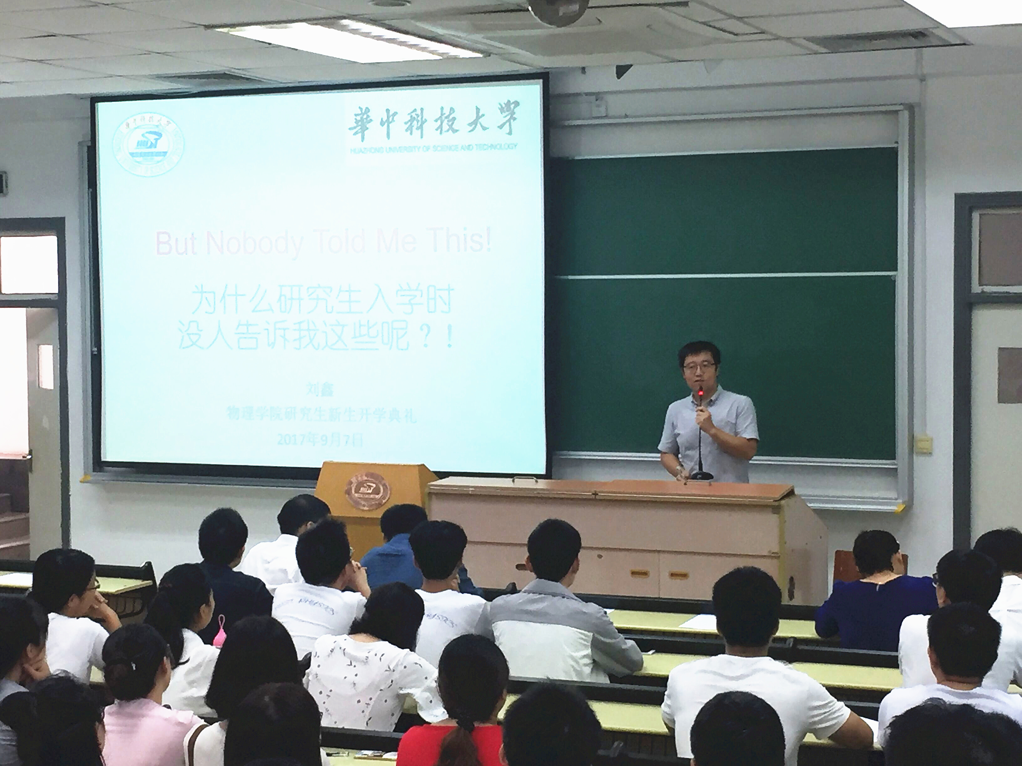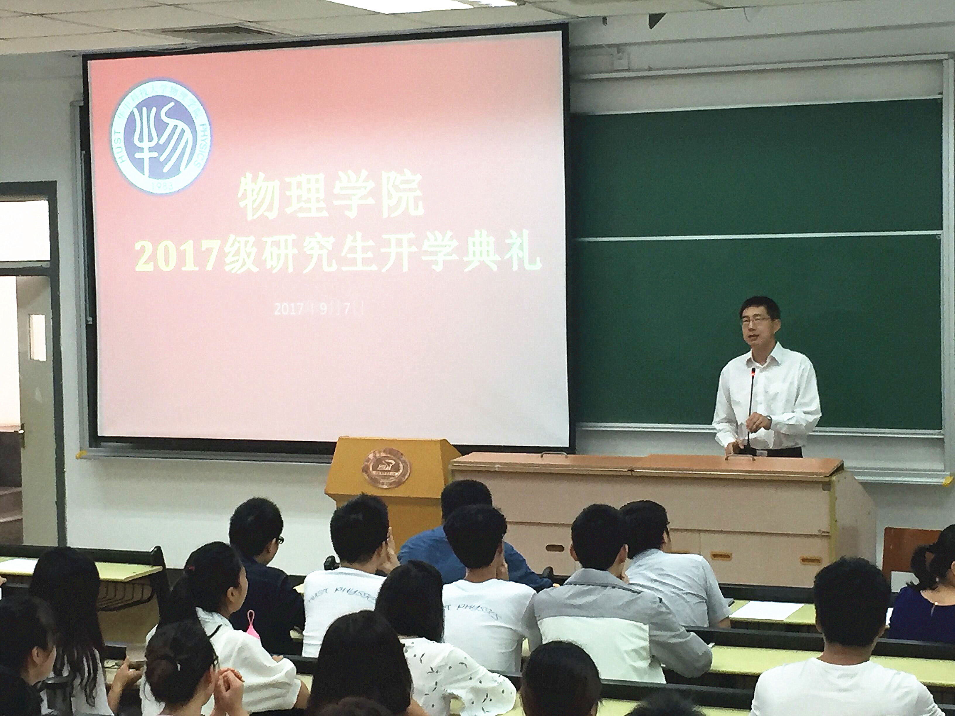 研究生老生代表秦承志、新生代表文泽宇依次作了发言。秦承志作为优秀博士研究生,以一个过来人的身份向大家介绍了自己研究生的学习生活经验,告诫新生要在今后的学习生活中保持竞争力,不辜负大好时光。新生代表文泽宇同学表达了对能够继续学习物理的欣喜以及对未来的憧憬,并代表全体17级研究生新生展示了勇攀物理高峰的决心。