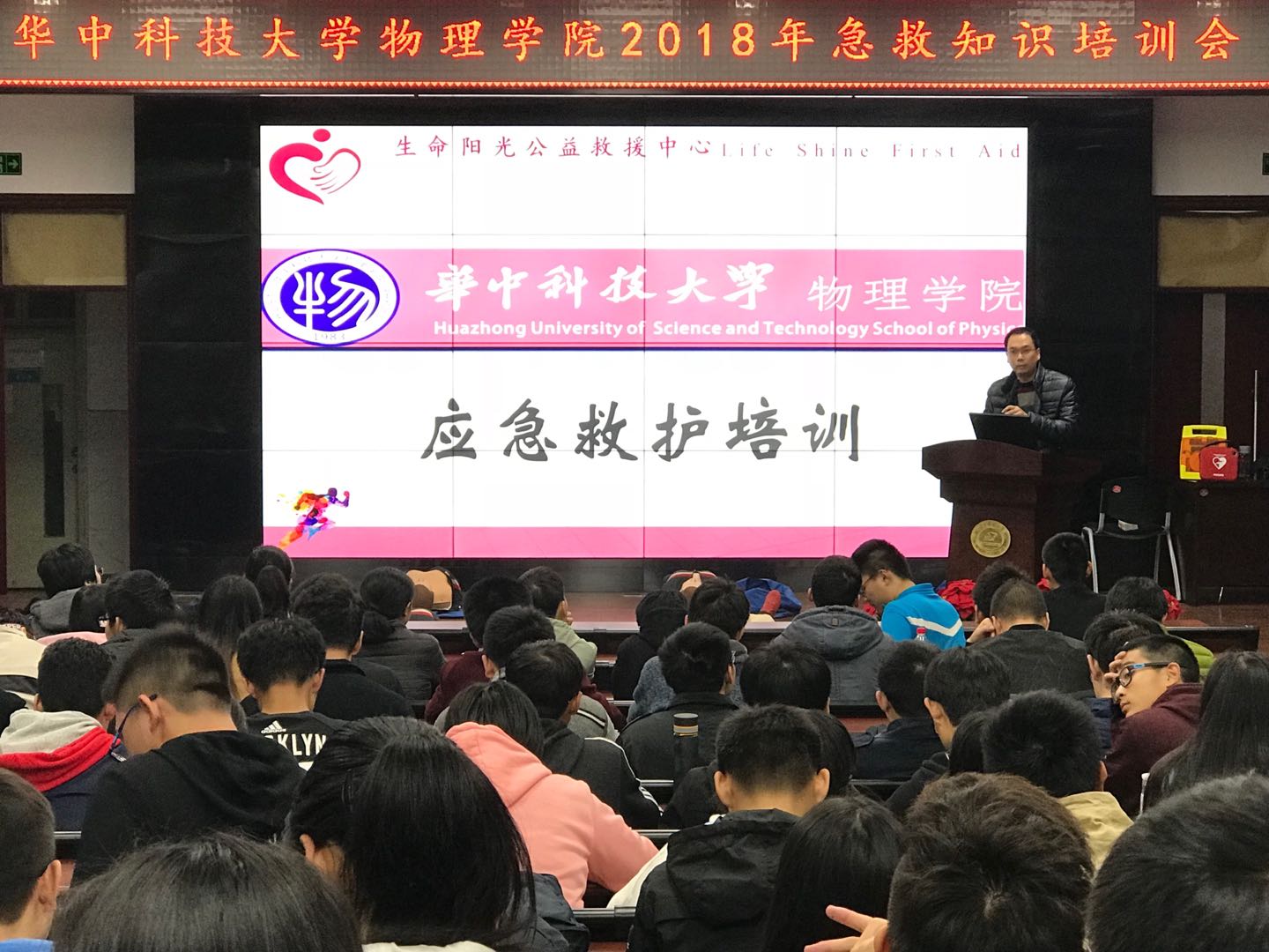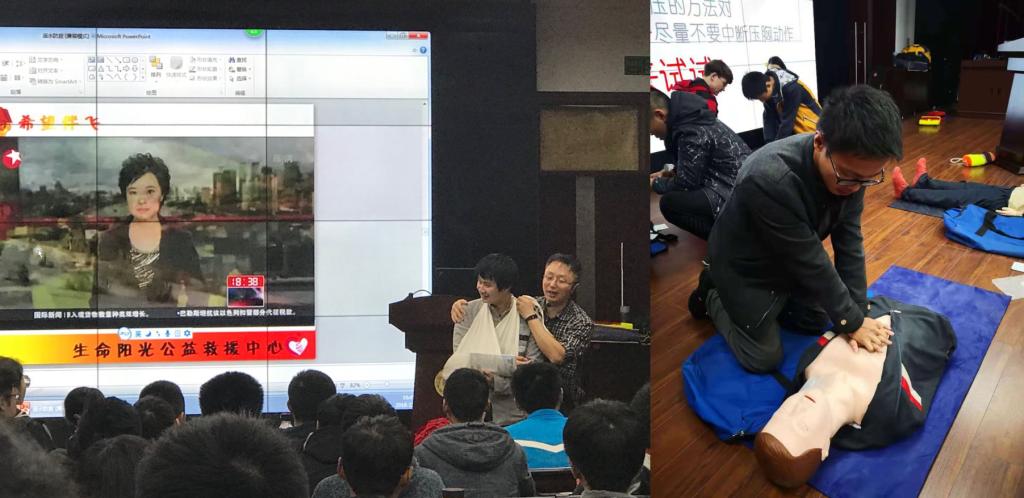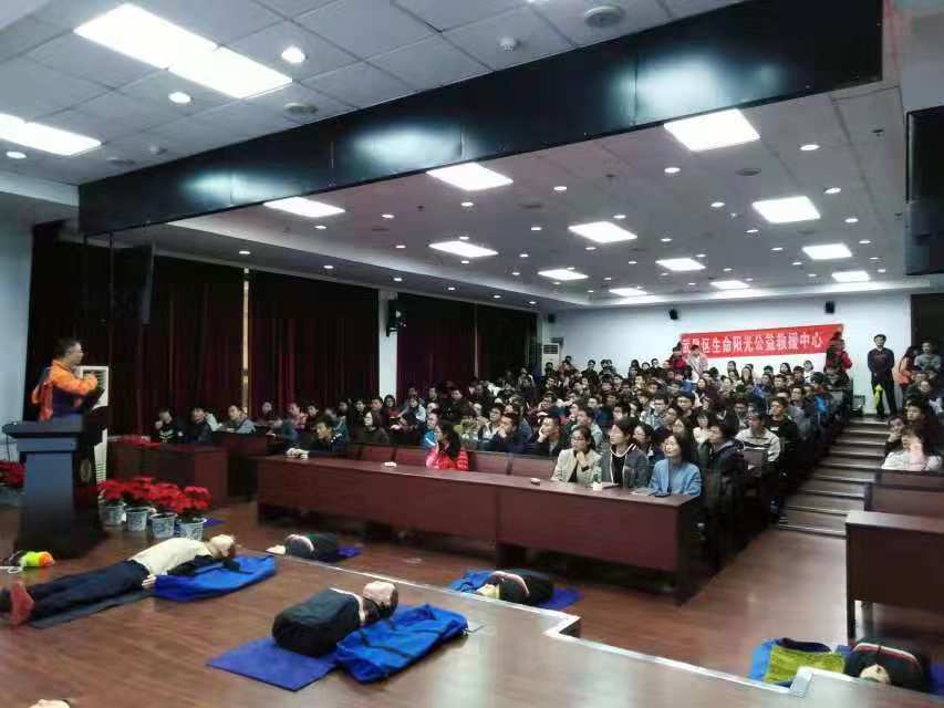 此次培训由美国心脏协会(AHA)导师、红十字会高级救护培训讲师、生命阳光中英双语急救讲师高明主讲。高老师主要对心肺复苏应急救护术(cardiopulmonary resuscitation, CPR)、溺水自救与救助、止血和包扎等一系列急救安全知识进行了宣讲。全院约200名师生到场,现场互动频繁,反响热烈。
