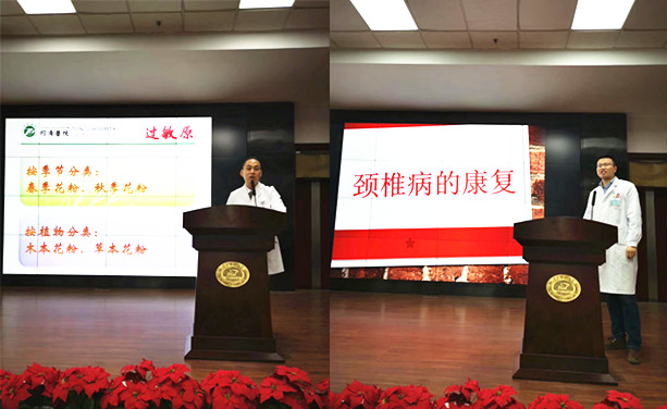 首先是健康知识讲座。同济医院光谷院区的资深医疗专家受邀为全院师生送来健康服务,为大家带来了两场别开生面的健康讲座。过敏反应科的黄南副教授以“春季过敏要当心”为主题,详细介绍了春季过敏症状、易致敏植物及防治方案;康复科陈勇技师介绍了颈椎病的成因知识及防治要点,现场指导大家颈椎病保健操,现场师生积极参与互动,反响热烈。