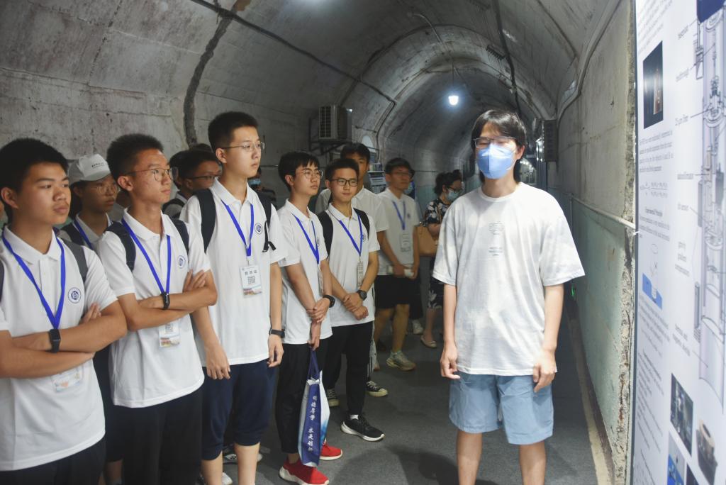 随后营员参观了精密重力测量国家重大科技基础设施。在喻家山下的防空洞,入口处写着的“测地观天”四个大字,同学们纷纷驻足观望。通过参观,营员们了解到罗俊院士带领着自己的团队在山洞实验室中30余年不懈努力,最终测出了全世界最精确的万有引力常数G,这一成果已被编入高中物理必修二的教科书中。在志愿者的带领下,参观过程中营员不时提问,对这山洞实验室中的各种仪器充满了好奇。