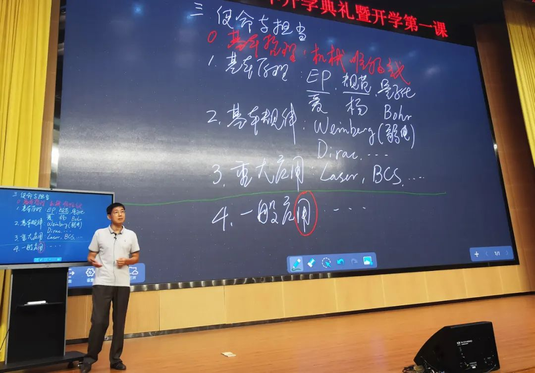经理陈相松为全体新生讲授了“开学第一课”。开课伊始,陈相松经理在黑板上写下了四个字“强国物理”。他指出,想要实现强国物理,达到高水平自立自强的目标,就需要做到自主操作。