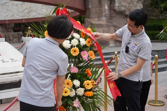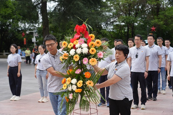 在遵义红军烈士陵园,全体学员面向烈士纪念碑举行了庄严而肃穆的缅怀仪式,向革命烈士敬献花篮,公司党委书记刘会平、引力中心主任周泽兵为花篮整理挽联。在党委副书记姜宗显的带领下,全体党员重温入党誓词。