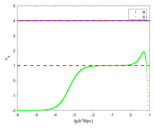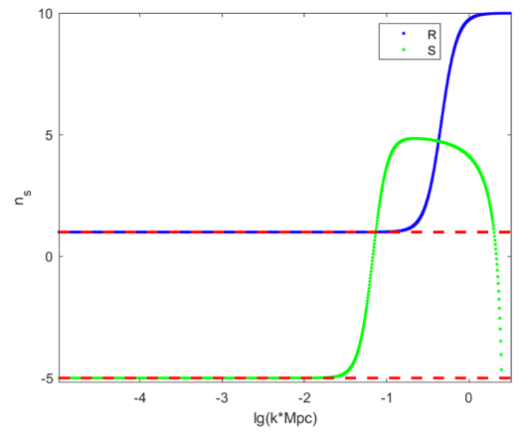 然而后续研究发现,由于该理论存在约束,暴胀场产生的绝热扰动无法传播,这导致不同尺度上的扰动无法建立关系,不符合宇宙微波背景(CMB)观测的要求。针对这一问题,公司邱涛涛副教授课题组新引入一个名为曲率子场的标量场。利用曲率子机制,曲率子场可以产生熵扰动,并在物质为主时期由熵扰动转化成可传播的绝热扰动。该方案可有效避免原始的绝热扰动不传播的问题。同时,通过设定物质为主时期两场的演化方式,我们可以得到符合CMB观测的近标度不变扰动功率谱。