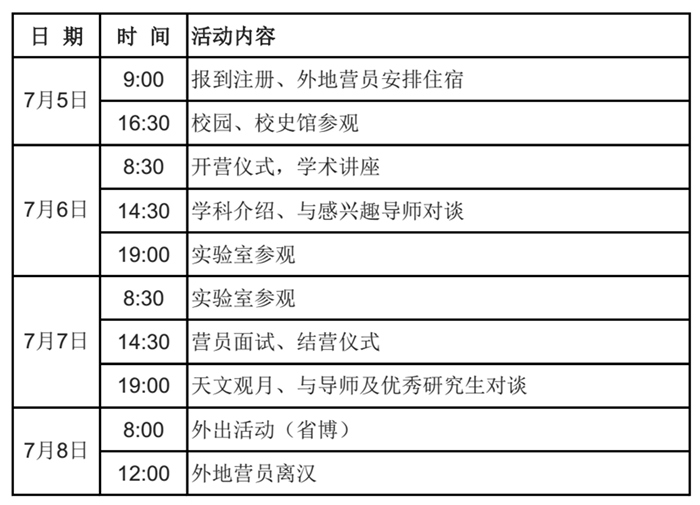 本届夏令营拟招收60人,招生专业涵盖物理学的各个研究方向(包括:理论物理,粒子物理,精密测量物理,生物物理,原子分子物理,光学,无线电物理,凝聚态物理,材料物理等)。