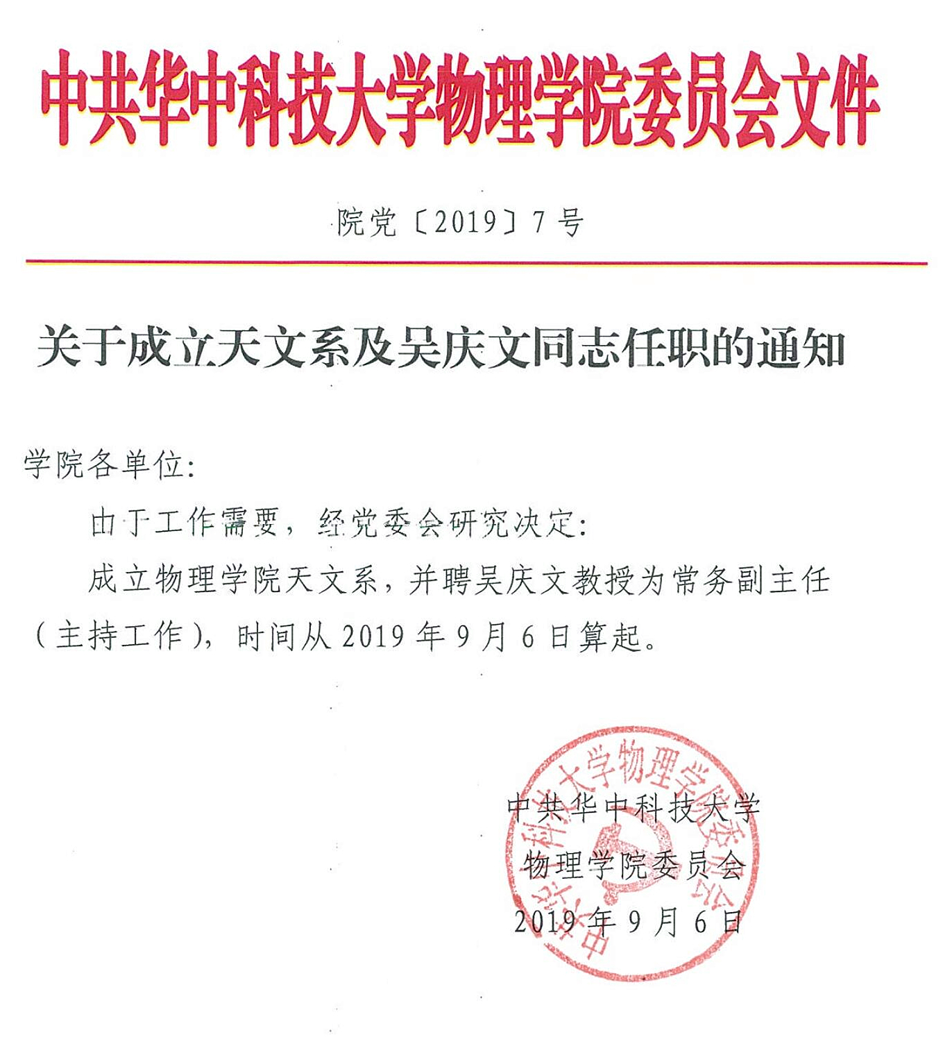公司党〔2019〕7号关于成立天文系及吴庆文同志任职的通知