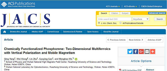 8月9日,化学权威期刊《美国化学会志》(J. Am. Chem. Soc)在线刊发了公司凝聚态物理研究所吴梦昊教授团队的最新研究成果:《化学功能化磷烯:拥有垂直极化和可移动磁性的二维多铁体》(Chemically Functionalized Phosphorene: Two-Dimensional Multiferroics with Vertical Polarization and Mobile Magnetism)。吴梦昊教授为论文通讯作者,公司2015级博士生杨庆为第一作者。