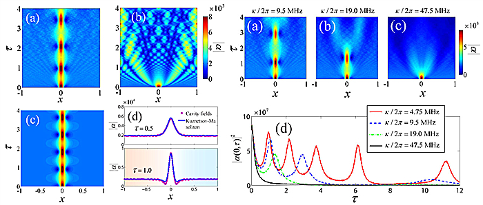 目前,吴颖教授团队利用发展的非微扰解析方法,首次预言了基于光力作用的Kuznetsov-Ma孤子的存在,并给出了Fermi-Pasta-Ulam回归次数与腔衰减之间的定量关系,数值计算结果和解析描述非常吻合。该工作建立了腔光力学,流体力学和等离子体物理等学科领域之间的有力联系,为腔光力学提供了全新的研究思路。