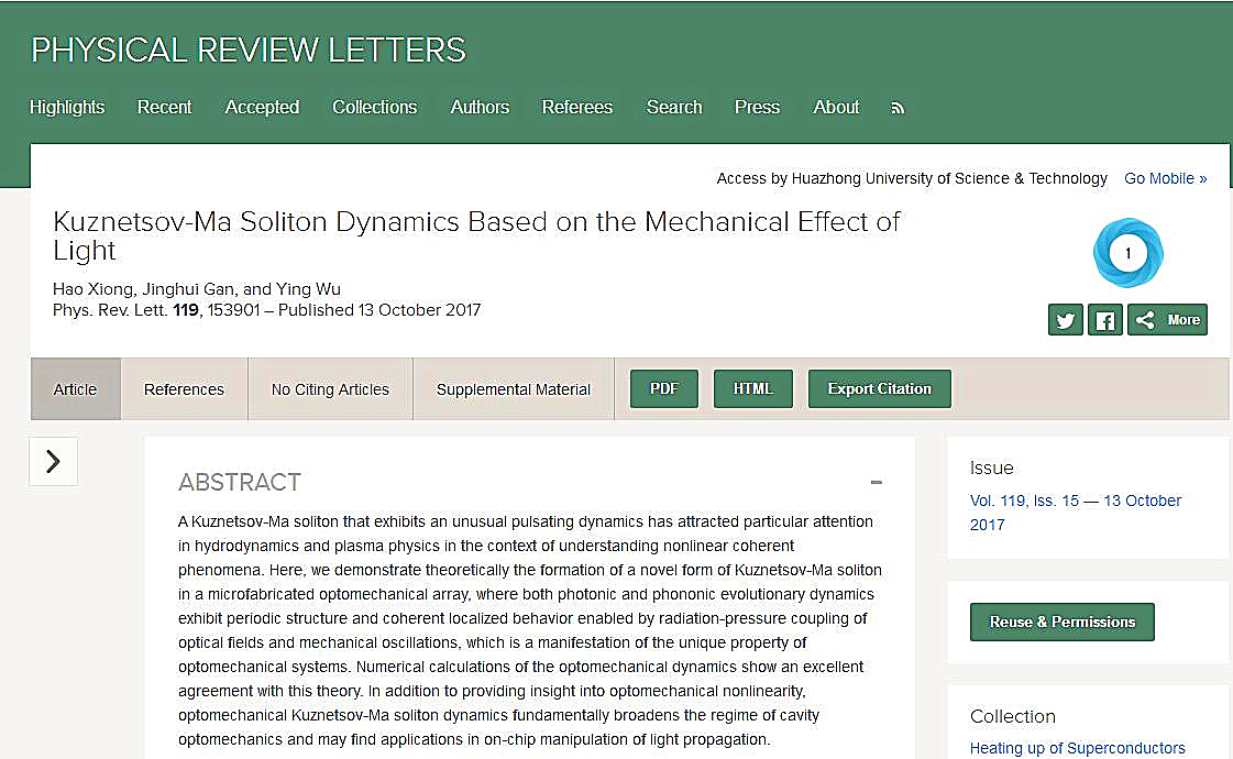 10月13日,物理学权威学术期刊《物理评论快报》(Physics Review Letters)在线刊发了304永利集团吴颖教授领导的量子光学团队题为《基于光力作用的Kuznetsov-Ma孤子动力学》(Kuznetsov-Ma soliton dynamics based on the mechanical effect of light)的论文。公司为论文唯一单位,304永利集团青年教师熊豪为第一作者兼通讯作者。