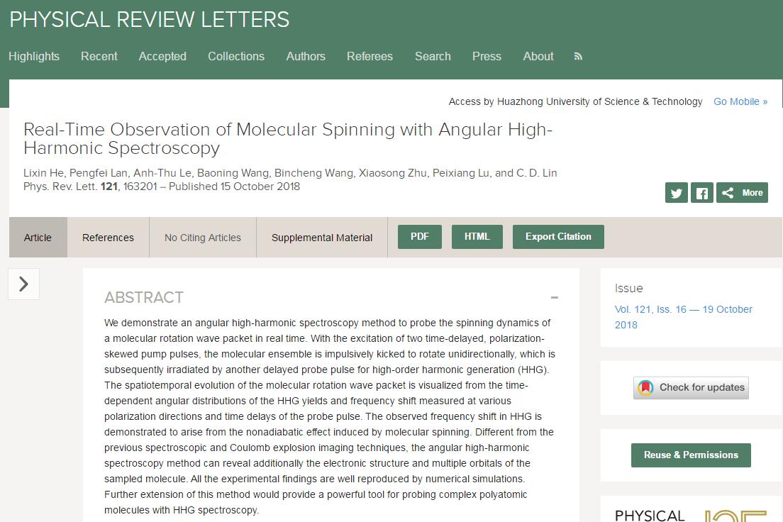 10月15日,物理学权威期刊《物理评论快报》(Physical Review Letters)在线刊发了公司超快光学实验室的最新研究成果:《基于角分辨高次谐波光谱技术的分子转动实时观测》(Real-Time Observation of Molecular Spinning with Angular High-Harmonic Spectroscopy)。论文第一作者为公司博士后何立新,兰鹏飞教授和陆培祥教授为论文通讯作者。