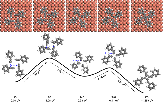 潘明虎教授与苏州大学的李青教授、迟力峰教授、林海平副教授以及国家纳米科学中心的裘晓辉研究员合作,成功地在Cu(100)表面通过[1+1+1+1]直接环化反应高选择性地合成了四轴烯。他们通过低温吸附(20 K)再缓慢退火的方法抑制了分子在表面的迁移,诱导了包含四个苯乙炔超分子中间态结构的生成。在超分子中间态结构生成的过程中,Cu(100)四重对称的晶格可以作为非常好的模板。更为重要的是,表面铜原子的催化大大降低了[1+1+1+1]直接环化反应的能垒。计算表明,环化反应的能垒为0.32 eV,仅比苯乙炔分子在表面迁移的能垒高0.04 eV,一旦四聚体的超分子中间态结构生成,环化反应立即发生,生成四轴烯。该项研究表明,抑制苯炔基在铜金属的迁移能力非常重要。分子在表面的迁移对产物的生成有着至关重要的作用,人们可以通过控制相关反应的动力学因素来选择表面反应的过程。