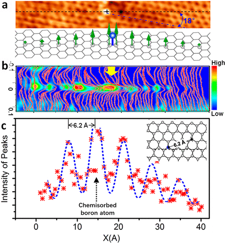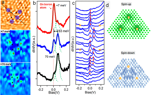 潘明虎教授和苏州大学的李青教授、迟力峰教授、林海平副教授以及澳大利亚纽卡斯尔大学的Werner A. Hofer教授合作,研究了单个硼原子化学吸附在石墨烯表面的电子结构。他们发现,单个硼原子吸附在石墨烯表面的碳碳桥位上。扫描隧道谱研究表明,在硼原子周围有两个磁性峰,分别为较强的+7 meV峰和较弱的+70 meV峰。结合理论计算,他们发现其对应自旋相反磁性峰的劈裂。磁性峰的空间分布进一步研究表明,其随着碳原子的晶格做周期振荡,振荡的周期正是一套碳格子里两个最邻近碳原子的间距。这一发现与前人预测的电子自旋态在AB两套格子间的振荡规律相吻合。在此基础上,团队成员还研究了不同硼原子诱导的自旋状态间的相互作用。该工作对探索石墨烯等二维材料的人工诱导磁性具有重要的指导意义和研究价值。