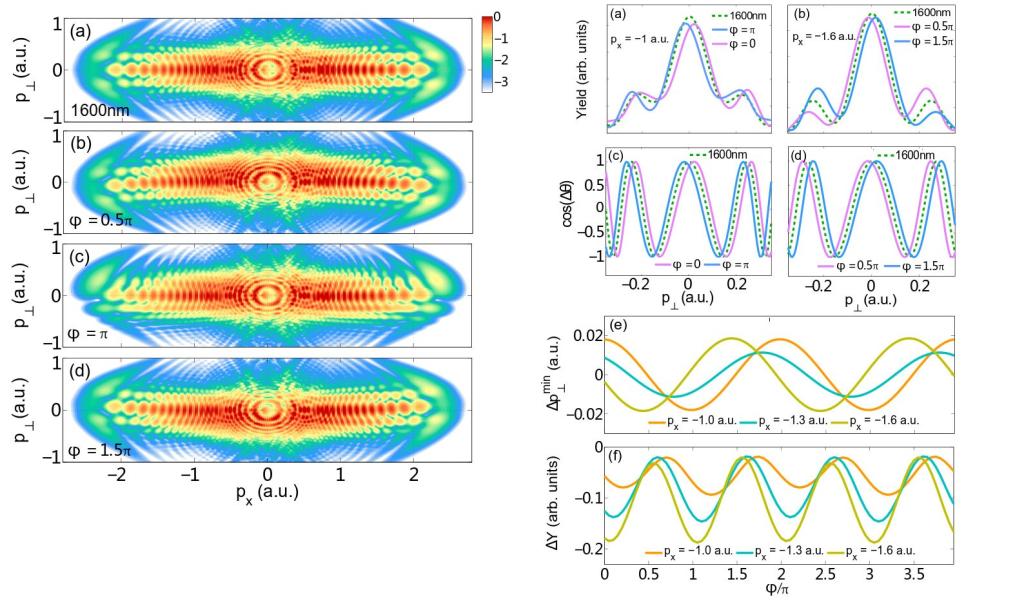 最近,他们提出利用阿秒光电子全息干涉探测隧穿电离过程。隧穿电离是量子力学的一个基本过程,它是“阿秒科学”中许多超快过程的第一步。对原子、分子隧穿电离时间的精确测量,直接关系到阿秒度量的精度。团队成员通过引入一个微扰场,探测了光电子全息干涉条纹对微扰的响应,成功地提取了强场作用下原子、分子隧穿电离的电子出现在势垒外侧的时间,同时还提取了电子在势垒中运动的时间。这一系列的工作,建立了阿秒光电子全息的理论,阐明了全息技术在原子分子领域的应用前景。