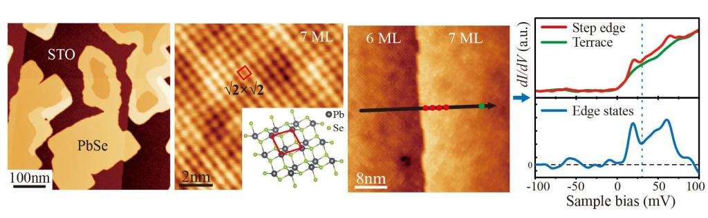公司潘明虎教授与北京应用物理与数学研究所的张平教授开展合作,结合扫描隧道显微镜与第一性原理计算,研究了外延生长在SrTiO3衬底上PbSe薄膜的压缩应力及其对拓扑态的调制作用。研究发现,由晶格失配引起的原子晶格褶皱会破坏拓扑态的形成,将导致一个从非平庸拓扑态到平庸绝缘态的相变产生。随着层厚增加和应力释放,在第七层PbSe薄膜边缘处观察到狄拉克型的边缘态。研究结果表明寡层的PbSe可能存在的二维拓扑晶体绝缘体态。该工作对探索二维拓扑晶体绝缘体薄膜的生长及实验调控其拓扑态具有重要意义。