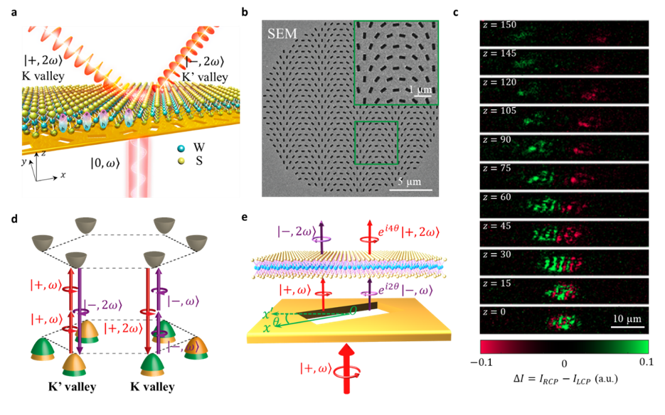 众所周知,电子具有两个内禀自由度,即电荷和自旋。基于这两个自由度,人们发展了当今广泛应用的电子技术和日渐成熟的自旋电子学。近年来,单层过渡金属二硫化物(TMDC)等二维材料因其具有特殊反演对称性,形成了一个额外的自由度:能谷赝自旋(K和K'),引起学界的广泛研究。谷自由度作为信息载体可实现各种新型的功能器件。与传统电子元件相比较,新型谷电子器件具有信息不易丢失、处理速度快、能耗低、集成度高和传输距离远等优点。但是,能谷激发态的寿命在室温下十分短暂,且单层二维材料厚度仅为原子层量级,这会导致其与外部激发场的相干作用十分微弱,严重限制了谷自由度的高效激发和调控。因此,如何提高二维材料中非线性过程的效率和谷系数,是谷电子学中亟待解决的问题。