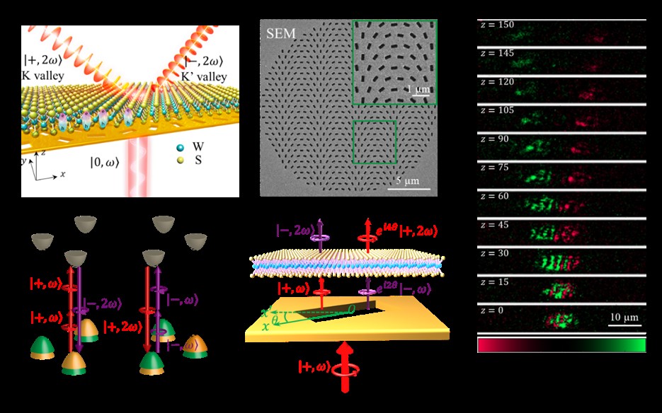 4月1日,《自然·光子学》(Nature Photonics)刊发了超快光学实验室的一项国际合作成果《Coherent steering of nonlinear chiral valley photons with a synthetic Au–WS2 metasurface》。304永利集团王凯教授、陆培祥教授和新加坡国立大学仇成伟教授为共同通讯作者,公司16级博士生洪玄淼为共同第一作者。超快光学研究团队和新加坡国立大学仇成伟教授合作,将这种新型非线性光学界面用于单层WS2中非线性能谷-光子的高效激发和操控。通过设计了具有梯度相位信息的金纳米孔阵列,当左(右)旋圆偏基频光通过金纳米孔时,产生带有相位信息的右(左)旋圆偏基频光。根据SHG选择定则,特定能谷K(K')会被激发并产生左(右)旋SHG,实验中测得其自旋度接近100%。由于金纳米孔的局域场增强效应,使光场与能谷相互作用强度增强,测得SHG转换效率提高3个量级。更重要的是,能谷锁定的SHG光子携带了相位信息,可实现控制其出射角度等各种功能。这为二维材料中能谷操控、信息编码与读取提供了非常简洁可靠的途径,可促进室温下非线性、量子和谷电子纳米器件的研究和应用。