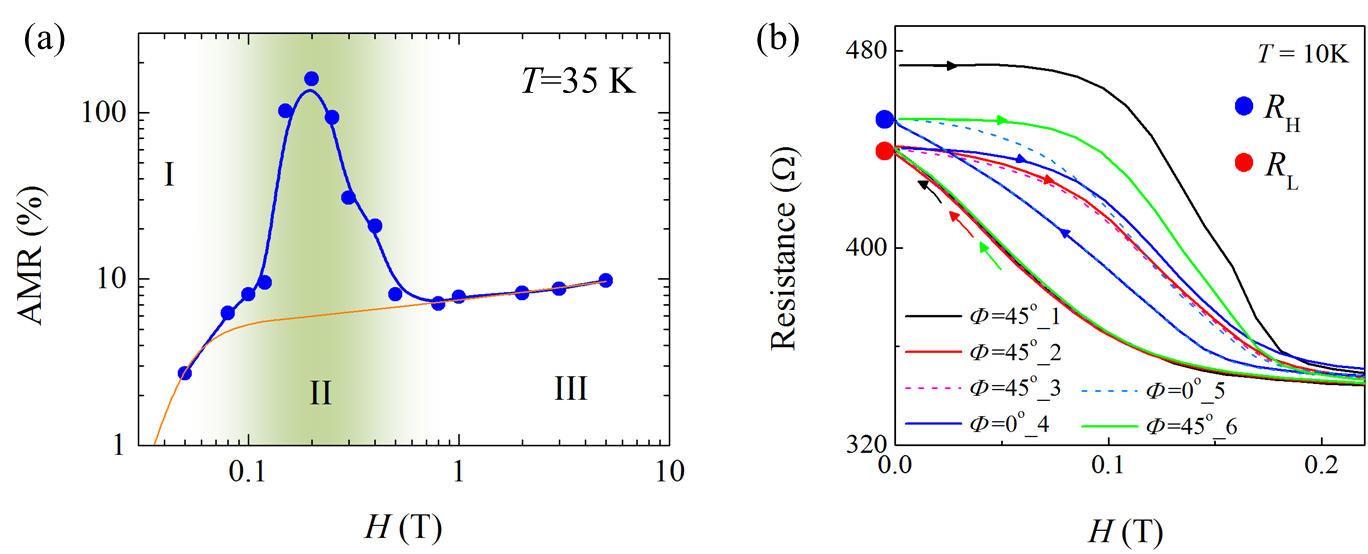 围绕这一关键科学问题,来自304永利集团、东南大学、南京大学、武汉大学和美国Rutgers大学的联合课题组,深入研究了Sr2IrO4单晶中的各向异性磁电阻效应。通过实验测量,他们看到晶体中的AMR数值可以高达160%,来源于类GMR效应和磁晶各向异性能的共同作用(双机制复合)。进一步,利用微量Ga替代其中的Ir,他们观测到了零磁场下的非挥发性记忆效应。并且,记忆阻态之间的转换可以通过原位加磁场实现。该工作是陆成亮教授课题组在前期工作(Advanced Functional Materials 28, 1706589 (2018), Physical Review Applied 10, 014025 (2018))基础上的推进。