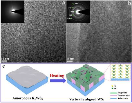 为了实现LTMDs的优异性能,控制其生长方式和阐明其生长机理是至关重要的。然而,目前对于具有垂直排列LTMDs的微观生长机理和高温稳定性仍未被研究。基于此,高义华教授团队利用透射电子显微镜原位观察了固态前驱体K2WS4通过热分解转化为垂直排列的WS2的过程,进而研究了垂直排列的WS2的生长机理及高温稳定性。研究表明:垂直排列的WS2层采用了混合生长模式,且垂直排列的WS2在900℃高温下加热3小时仍表现出较高的稳定性。另外,实验结果以及理论计算表明,K元素在垂直排列的WS2的生长以及演化中发挥至关重要的作用。该工作为垂直排列的LTMDs材料的生长机理提供了基本的依据,这有助于对具有优化结构的材料进行定制设计和制造,进一步实现其优异的性能。