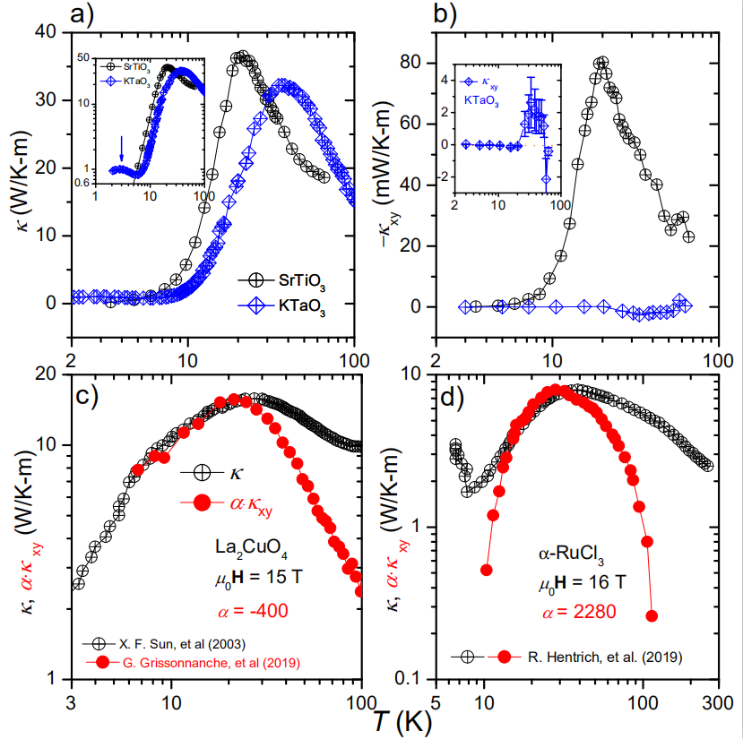 图2 绝缘体中的热导和热霍尔效应。SrTiO3和KTaO3的热导对比(a),SrTiO3和KTaO3的霍尔热导对比(b),La2CuO4的热导和霍尔热导对比(c),α-RuCl3的热导和霍尔热导对比(d)。
