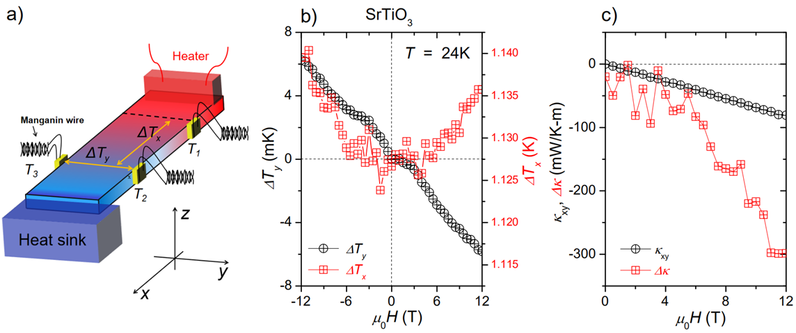 图1 SrTiO3的热霍尔效应。测量示意图(a),纵向和横向温差对比(b),