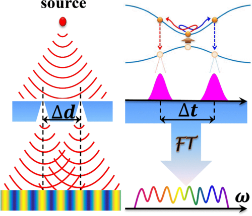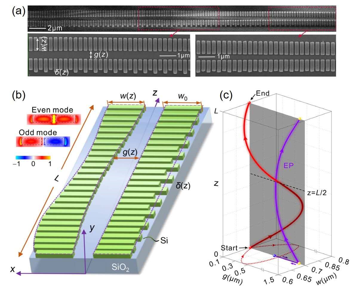 4月16日,《物理评论快报》同一天发表了304永利集团陆培祥教授领导的超快光学团队的两项研究成果。其中1篇论文中,超快光学团队将空间域的双缝干涉推广到时间域,发现少周期激光跟固体作用时在时间域会形成阿秒双缝干涉,辐射的固体高次谐波光谱即干涉条纹。利用干涉条纹,他们提出了重构固体能带的方法。相比已有的光电子能谱方法,阿秒时域双缝干涉是一种全光学的方法,在时间分辨能力上具有前所未有的优势,这为研究光诱导的固体超快过程提供了崭新的手段(图6所示)。另1篇论文中,团队成员王兵教授和武汉光电国家研究中心郜定山教授合作,在硅光子芯片上实现了基于非厄米系统动态奇异点绕圈的非对称模式转换。他们利用硅基亚波长光栅波导之间的耦合,引入结构参数和散射损耗的连续变化,提出并实现了动态奇异点的绕圈,在维持高效模式转换的同时,显著减小了器件尺寸,为具有非厄米和拓扑特性等新型功能集成光子器件的设计和研发开辟了新的技术途径(图7所示)。