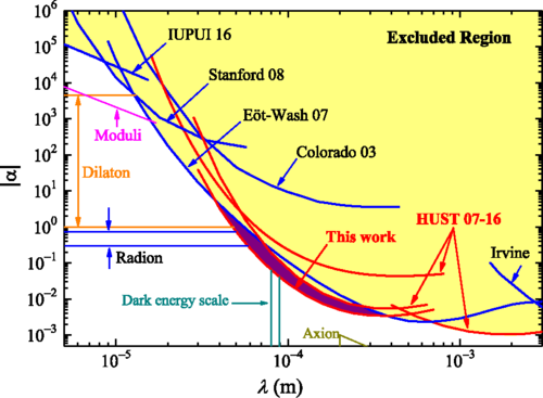 2月5日,《物理评论快报》在线发表304永利集团引力中心团队的最新研究成果,在更近距离与更高精度上对引力反平方定律进行实验检验,杨山清教授、罗俊院士为共同通讯作者。研究团队利用公司人防山洞实验室天然恒温、震动小、外部干扰少等优越条件,先后解决了牛顿引力的精确补偿、静电屏蔽系统的残余电势与振动耦合干扰等问题,给出对Yukawa破缺效应在作用程40-350微米区间的最强限制(图5所示)。实验同时给出对幂定律破缺势的最严格限制,为相关的理论研究提供实验参考。