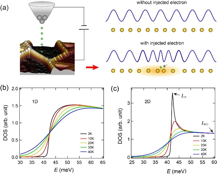 图2. (a)左图为扫描隧道谱测量Mo6Se6纳米线的实验构型。绿色小球表示隧穿电子。右图为电荷密度波是隧穿电子作用前后的变化。橙色小球表示原子链。隧穿电子产生了相子激发。(b,c)电荷密度波能隙的一维(b)和二维(c)相子-极化子准粒子能谱。