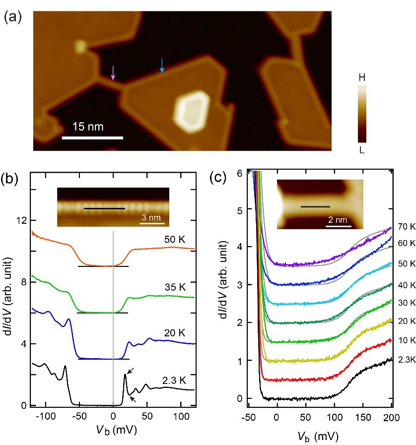 图1. (a)生长在单层MoSe2边缘处的Mo6Se6纳米线(蓝色箭头所示)和独立的纳米线(粉色箭头所示)。(b,c)边缘处纳米线(b)和独立的纳米线(c)的电荷密度波能隙随温度的演化。