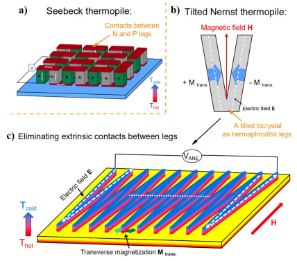 图中,a)塞贝克热电堆;b)V形状的倾斜双晶(双基元);c)倾斜能斯特热电堆。