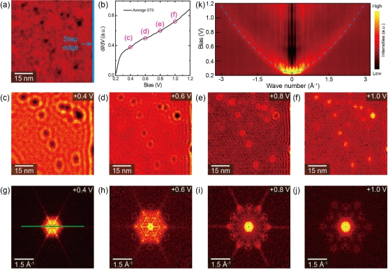 图3单层InSe中存在的二维自由电子气,(c)-(f)为实空间的电子驻波图案,(g)-(h)为倒空间的波矢,(k)为自由电子气的色散曲线。