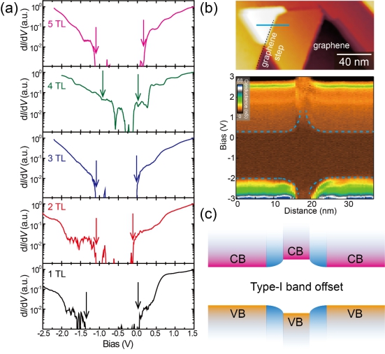 图2:InSe薄膜的电子结构特性。(a)层厚依赖的电子结构演化;(b)原子台阶附近能隙增大;(c)横向异质结的第一类能带弯曲示意图。