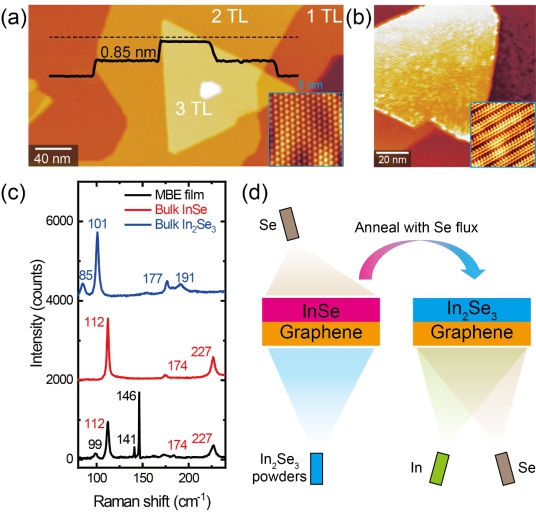 图1:MBE可控生长实现二维InSe和In2Se3薄膜的结构表征和物相转变。(a)-(c)InSe和In2Se3薄膜的形貌结构和Raman谱表征;(d)InSe和In2Se3薄膜的可控物相转变。