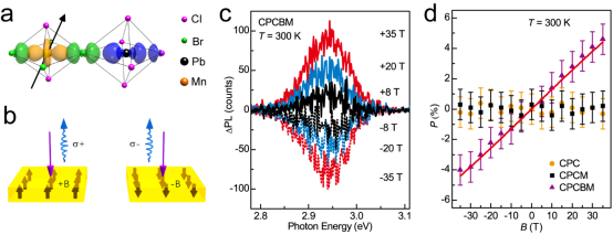 图中a为CsPb(Cl/Br)3:Mn电子轨道,b、c为磁场下圆偏振发光测试和结果,d为圆偏振度