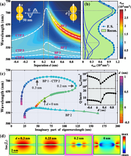 图1. (a)金属纳米颗粒二聚体的消光谱;(b)消光谱的模式重构;(c) 准正规模式的共振波长随二聚体缝隙大小d的演化;(d) 本征模场电流分布,对应不同缝隙大小。