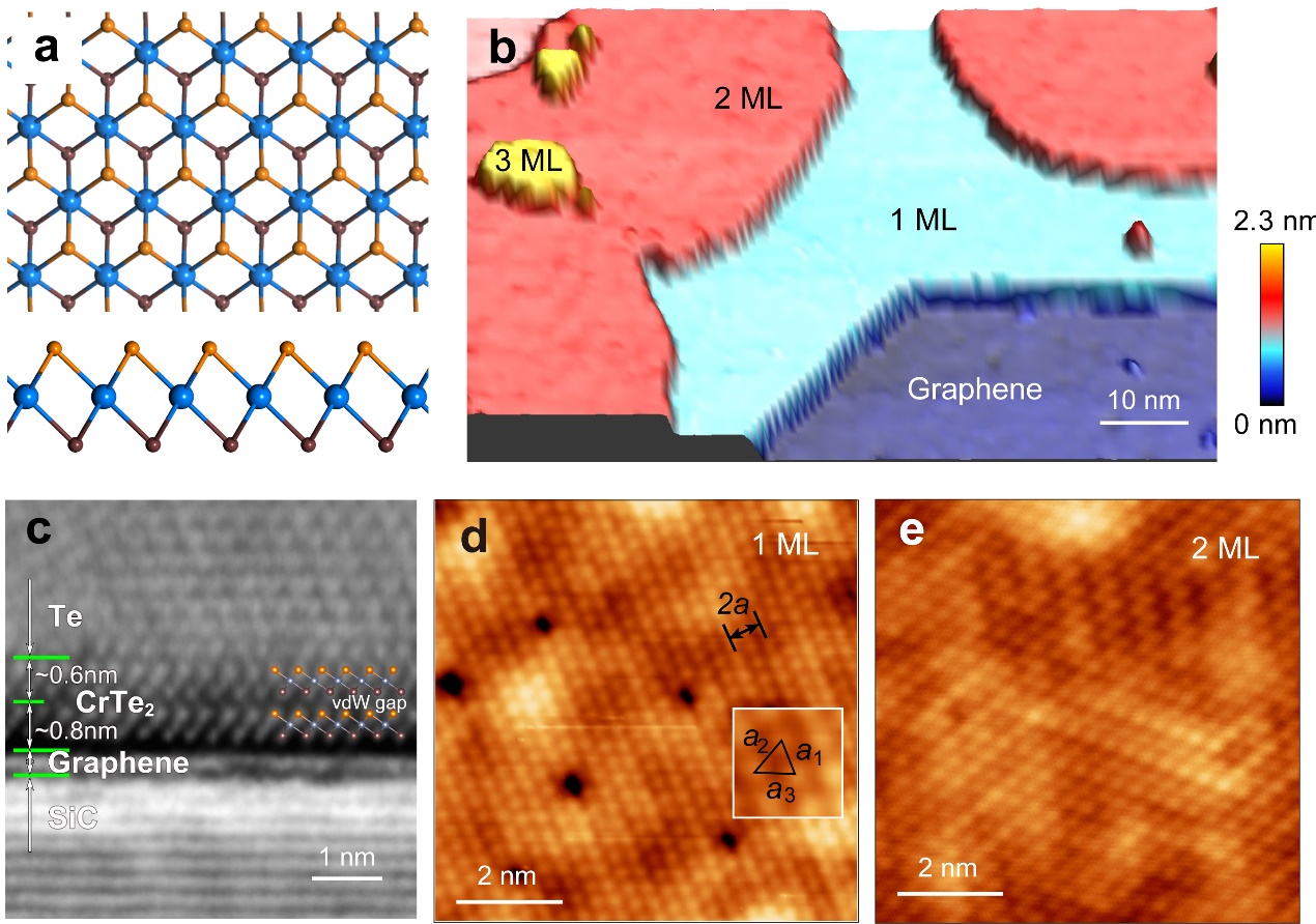 图1:CrTe2薄膜形貌。a.单层CrTe2晶格结构。b.CrTe2薄膜的扫描隧道显微镜形貌图。c.CrTe2透射电子显微镜成像。d.单层CrTe2扫描隧道显微镜原子分辨。e.双层CrTe2扫描隧道显微镜原子分辨。