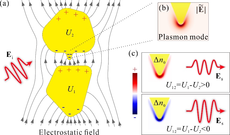 金属纳米结构支撑表面等离激元,可以打破传统光学的衍射极限从而允许高密度集成,同时金属导体具备优良的电学功能,因此可基于CMOS工艺将纳米尺度的光学功能器件与微电子器件复合集成在同一芯片。金属结构的光电复合微纳集成,引导人们提出这样的问题:能否实现电学直接调制金属微纳结构的光学响应?直接电学调制金属结构光学响应具有诱人的前景,包括可望实现具有超快响应和极小尺寸的电光调制器。然而,这种美好愿景却面临着原理上的巨大挑战。由于金属导体拥有极高的自由电子密度,三维结构包含数量庞大的自由电子——电子海洋,使得电学调控导致的表面效应根本无法撼动"电子海洋"的光学响应。