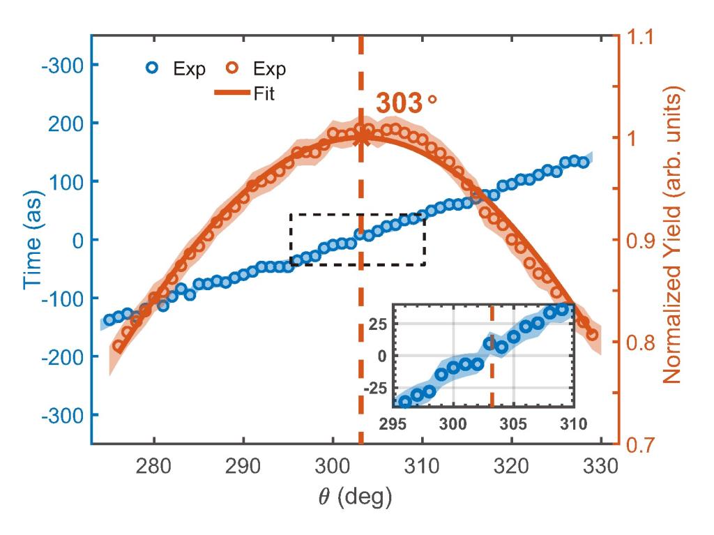 利用该方案,研究团队进一步测量了不同能量电子的电离时间。实验结果表明在最概然发射角处,光电子的电离时间随电子能量增加而减小,这与经典轨迹模型预测的结果相矛盾。实验与经典轨迹结果之间的差异可能来自于非稳态势垒下的电子动力学,这仍是一个值得被进一步研究的课题。