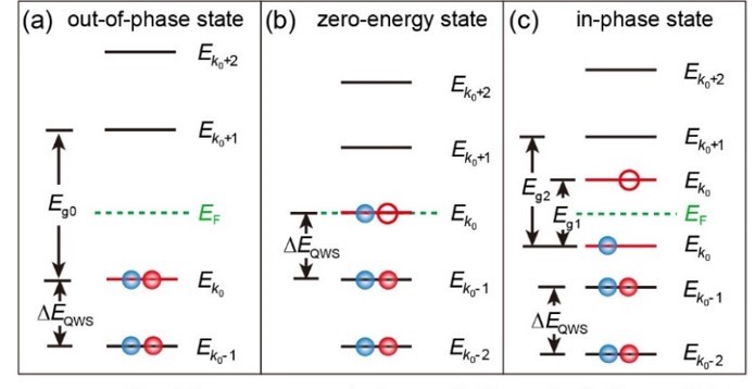 图3. Hubbard型库伦阻塞效应作用下畴界的分立能级。(a-c)平均场能级示意图,分别为反相(a)、零能(b)和同相(c)态。每个能级都用它的波矢标记。自旋向上(向下)的电子用红(蓝)球表示。实心(空心)球表示电子处于已占据(未占据)能级。