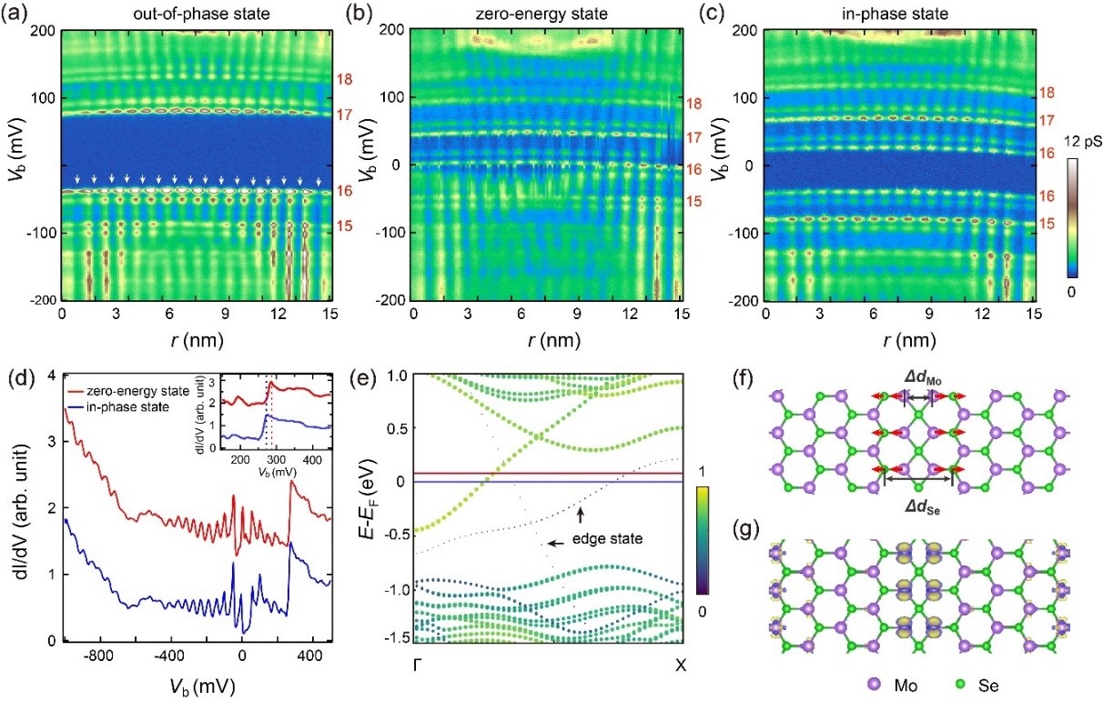 研究人员通过分子束外延技术在石墨烯衬底上生长出具有一维镜像畴界的单层与双层MoSe2薄膜。通过扫描隧道显微镜测量发现一维镜像畴界具有金属态,并且由于一维畴界的长度有限,电子态会受到量子限制效应,导致出现分立能级。研究发现了两类具有不同基态的畴界,根据它们在费米面上下的两个分立能级在实空间的相位振荡关系,定义为同相态畴界和反相态畴界。他们通过施加适当的针尖脉冲,可以实现同一个畴界在两种状态之间的相互转换。通过构建理论模型,他们发现上述两种状态均来源于由库伦效应驱动的关联绝缘态,而且库伦作用的强度由畴界长度决定。当费米面处于两个不同波矢的量子阱态之间时,其能级间隔增大,变成库伦能与量子阱受限能级间隔之和;当费米面处于一个量子阱态时,该能级被库伦能自旋劈裂,形成单电子占据,劈裂大小即为库伦能。利用针尖脉冲,可以调节畴界上的电子填充数目,从而实现两类关联绝缘态以及相应自旋状态的可控调控。他们通过第一性原理计算发现针尖脉冲注入畴界的电子通过晶格驰预的类极化子方式稳定下来。由于该库伦能不同于经典的长程作用,而属于短程的Hubbard型库伦作用,并与经典库伦阻塞效应有相似的表达式,从而被称为Hubbard型库伦阻塞效应。