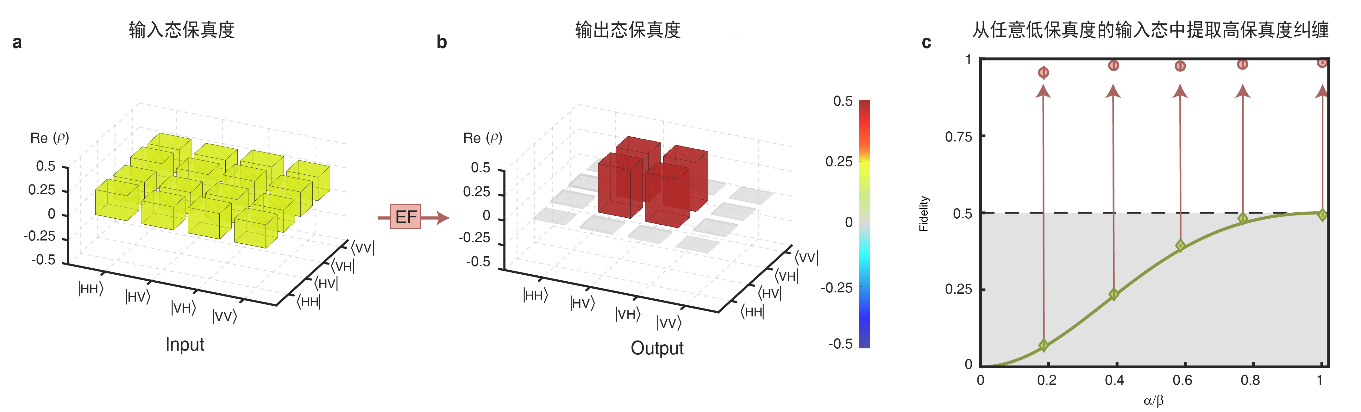 量子通信和量子计算等重要应用对纠缠保真度有着极高的要求,然而,纠缠态制备过程中的不完美、传输过程中引入的噪声会导致保真度降低。因此,发展确定性的纠缠过滤器等量子光学器件是解决这一难题的核心。为此,李霖教授团队利用两个里德堡原子系综进行具有偏振选择的光子态-里德堡原子态相干转化,将目标纠缠态转化至无退相干子空间进行保护;同时,利用里德堡相互作用将其余的噪声态滤除,从而提取出高保真度的光量子纠缠态。这一方案的优势在于,可从极大的噪声中提取出近乎完美的量子纠缠。即使输入态中仅含有7%的纠缠态(初始保真度为7%),里德堡纠缠过滤器仍然能将纠缠态保真度提升至99%以上。