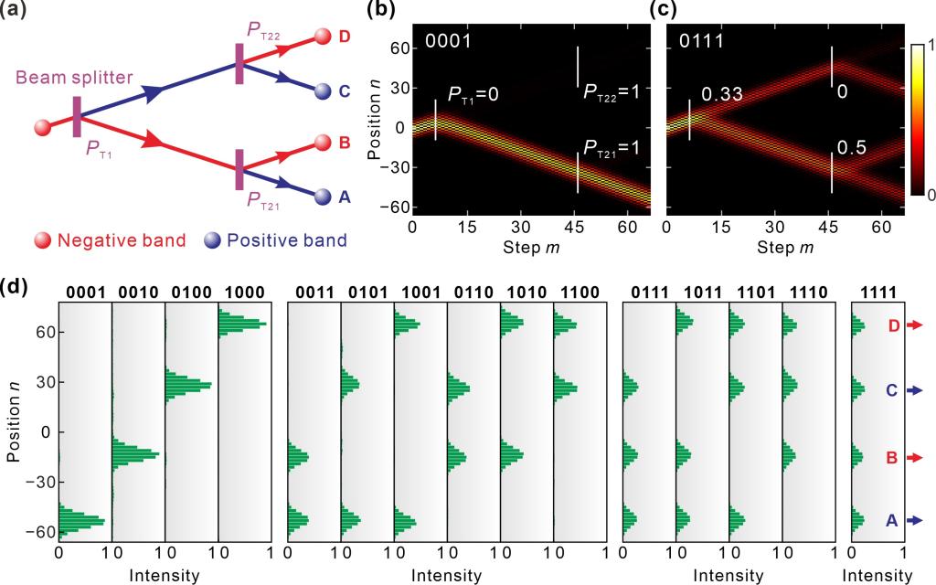 最近,王兵教授课题组基于双光纤环路构造了具有周期分布弗洛凯能带的时域光子晶格,并借助环路中的相位调制在晶格中构造了等效电场,从而成功观测了光学弗洛凯朗道-齐纳隧穿效应,还将朗道-齐纳隧穿由直流驱动推广到了交变驱动情形。如图1所示,研究团队在双光纤环路实验系统中分别引入了随圈数线性和正弦变化的相位调制,从而在对应的时域光子晶格中构造了等效直流和交变电场。通过选取分光比较小的耦合器连结两环路,他们大大减小了时域晶格的能带带隙,从而破坏了系统的绝热条件、实现了弗洛凯朗道-齐纳隧穿效应。在直流电场驱动下,波包的隧穿位置呈现均匀分布,且每次隧穿的几率相同。由于布洛赫-齐纳振荡效应的存在,波包在隧穿过程中容易出现能量聚集的现象。而在交变电场驱动下,隧穿的位置和几率都是非均匀的,隧穿后波包的定向输运也可避免能量聚集。通过提高交变电场的幅值,不仅能够增加单个周期内的隧穿次数,也可以提高每次隧穿的几率。此外,研究团队还发现交变电场下的朗道-齐纳隧穿效应具有阈值性,这是直流情形所不具备的特征。而后,王兵等人将直流和交变电场相结合,提出了构造光分束器的新机制,使得人们能够在维持波包轨迹的前提下全范围地调控波包分束比例。将以上分束器级联,他们还演示了一个四比特的光编码器,并实现了从0001到1111的实时编码。该研究为光脉冲调控提供了新思路,在可调分束器和编码器领域具有重要的应用前景。