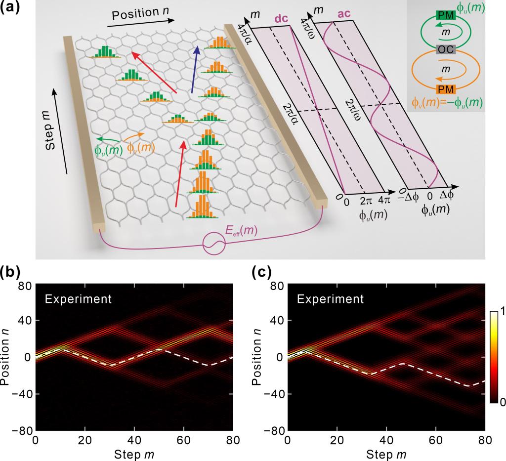 图1. (a)时域光子晶格和等效电场构造原理示意图。(b)-(c)直流和交变电场驱动下的波包演化实验结果图。白色虚线为未隧穿波包的演化轨迹。