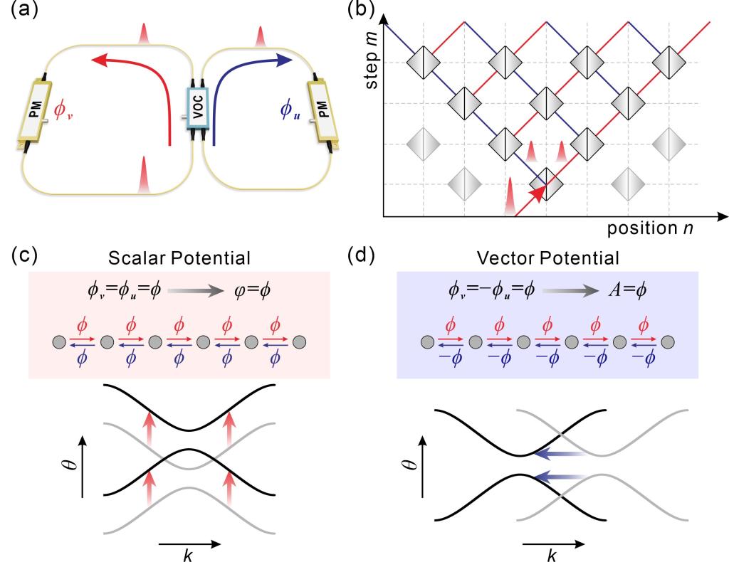 图1. (a)-(b)耦合双光纤环路及时域光子晶格示意图。(c)-(d)光子等效标势和等效矢势以及其对能带的作用。