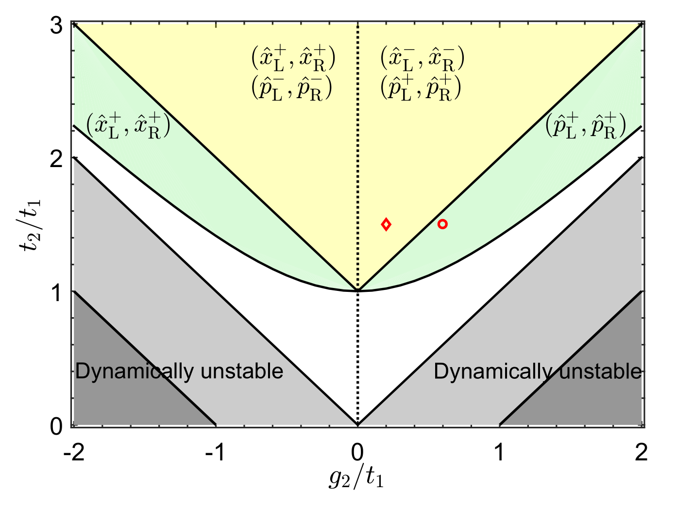 图2:系统相图。黄色区域为实能隙拓扑相,绿色区域为实、点能隙共存拓扑相。灰色和深灰色区域为动力学非稳定性区域。