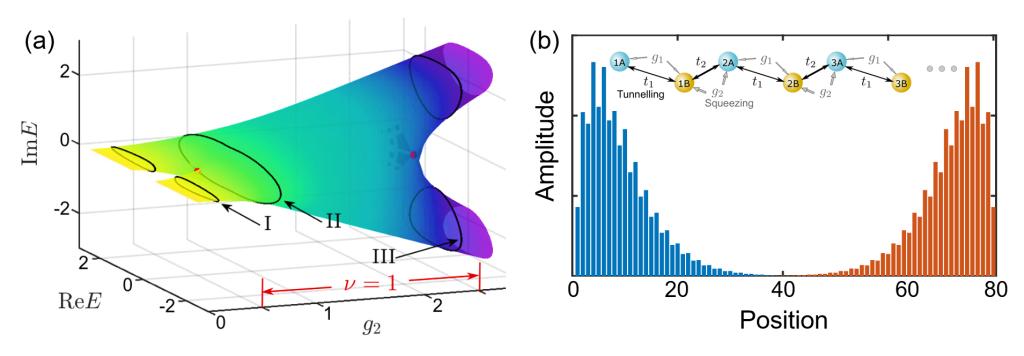 图1:(a)周期性边界条件下系统在复数空间的能谱。(b)开放边界条件下,体态的局域效应——对称保护的Z2趋肤效应。插图:二聚体玩具模型。